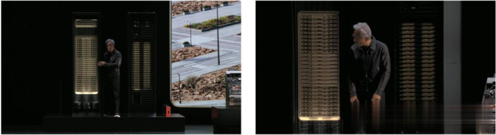 为了更直观说明,老黄再次上演「芯片版美队」,手里拿着巨型芯片,由72块GPU无缝互联。