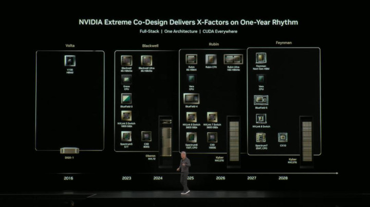 现场,老黄再次搬出了,未来三年英伟达GPU路线图,从Blackwell,到Rubin,再到Feynman。